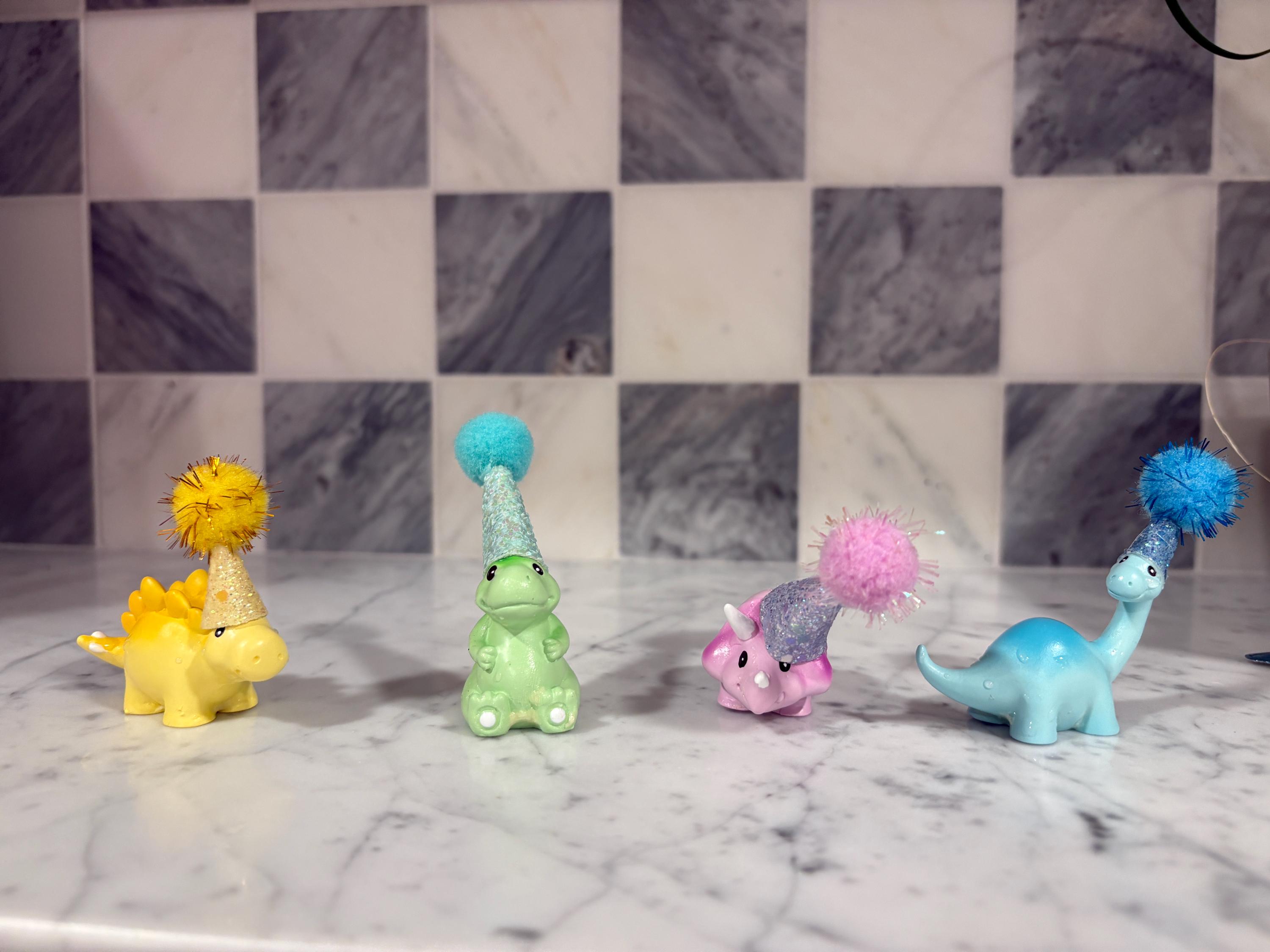 These little party dinosaurs are ADORABLE!! Oh my goodness!! The care the artists used in their packaging, as well as their thoughtfulness in fulfilling a special color request and providing "just in case" items was over and above!! Please, PLEASE do not hesitate to support this small business with your purchase! You will not regret it!! They are PERFECT!!!! Thank you for helping make my granddaughter's second birthday cake so wonderful!