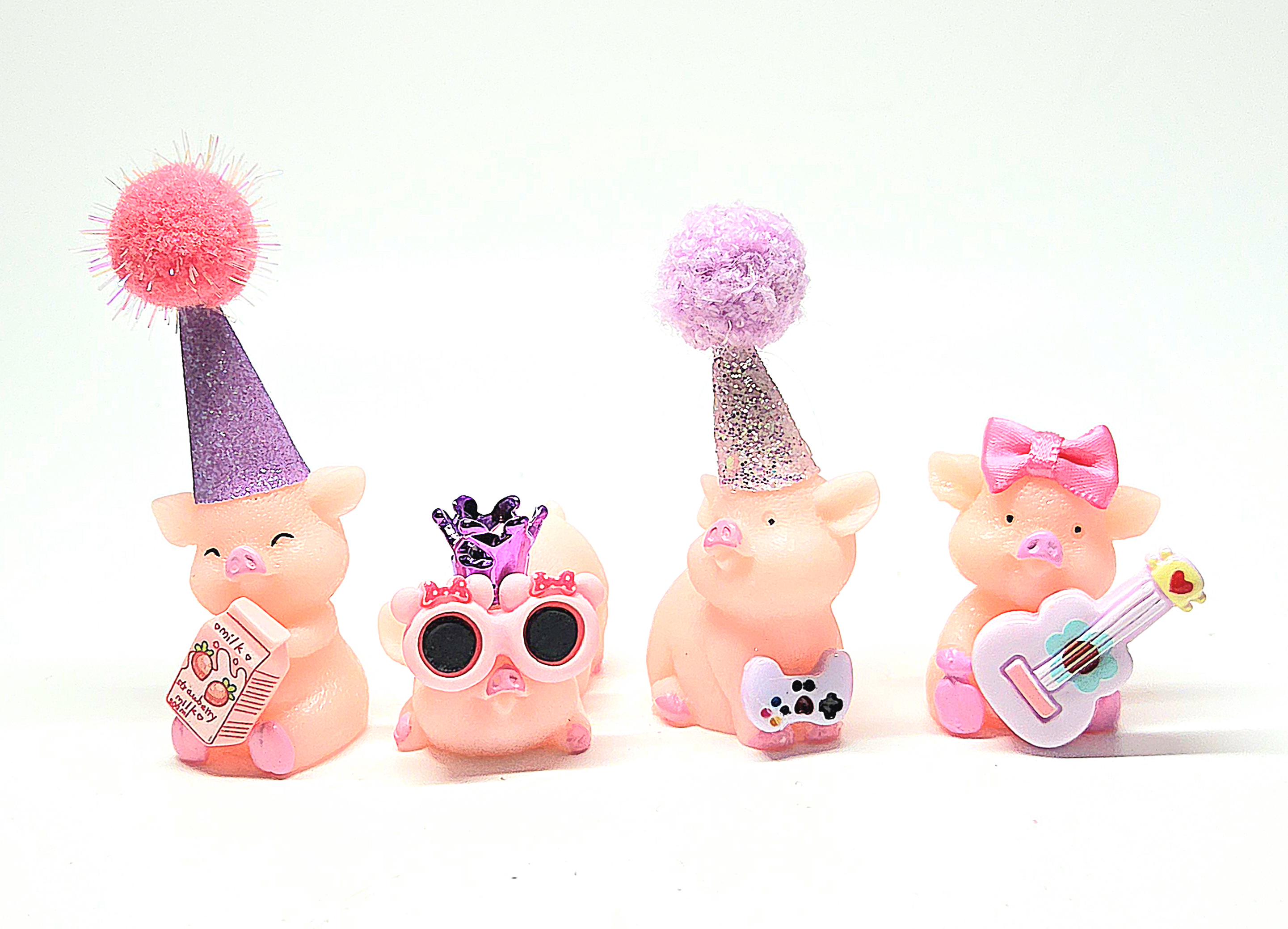 These cheeky cartoon style piggy cake toppers are just too adorable! They come as a set of FOUR with a selection of adorable accessories and beautiful chunky glitter party hats.