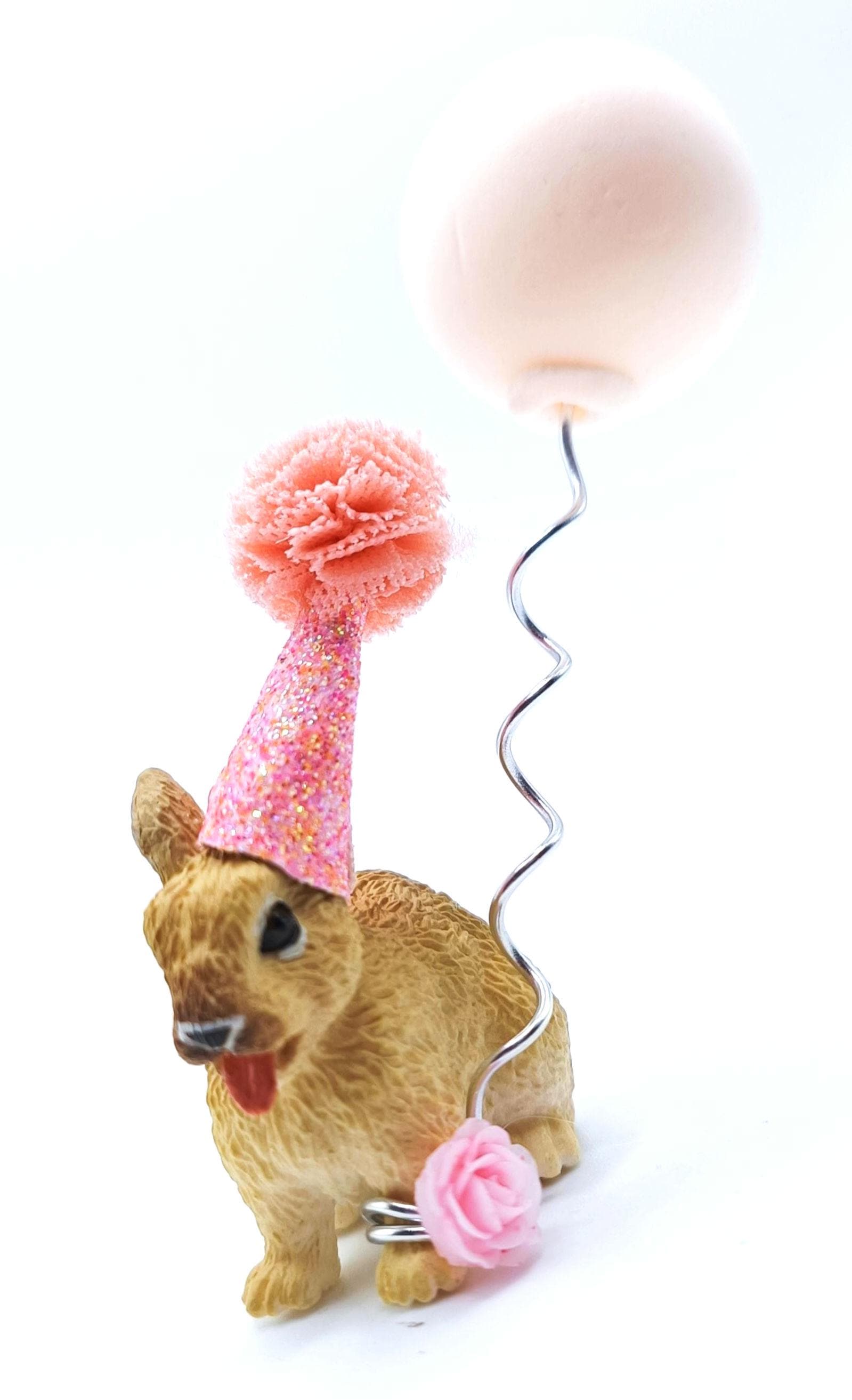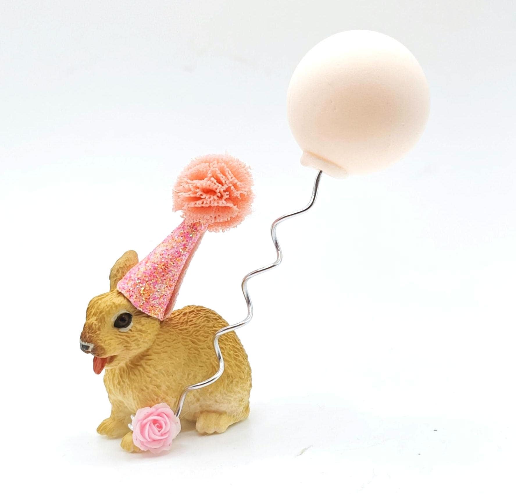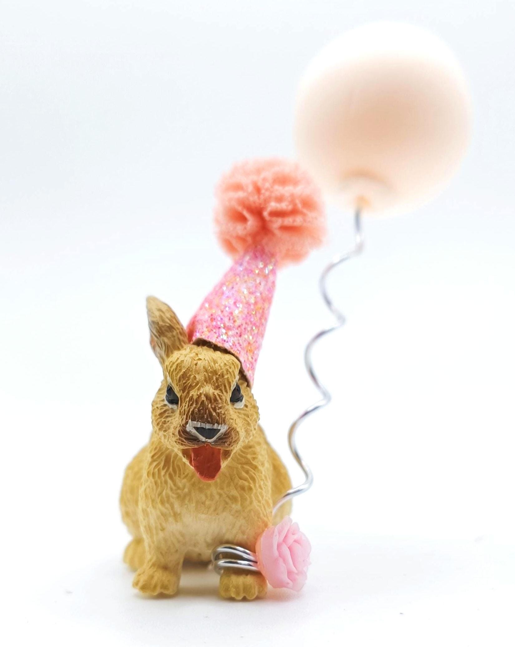 This little bunny is high quality and adorable, look at its little tongue!!! it will add some real cuteness to your party celebration. The bunny comes with a hand crafted mini party hat and would be perfect as a cake topper or table decoration.